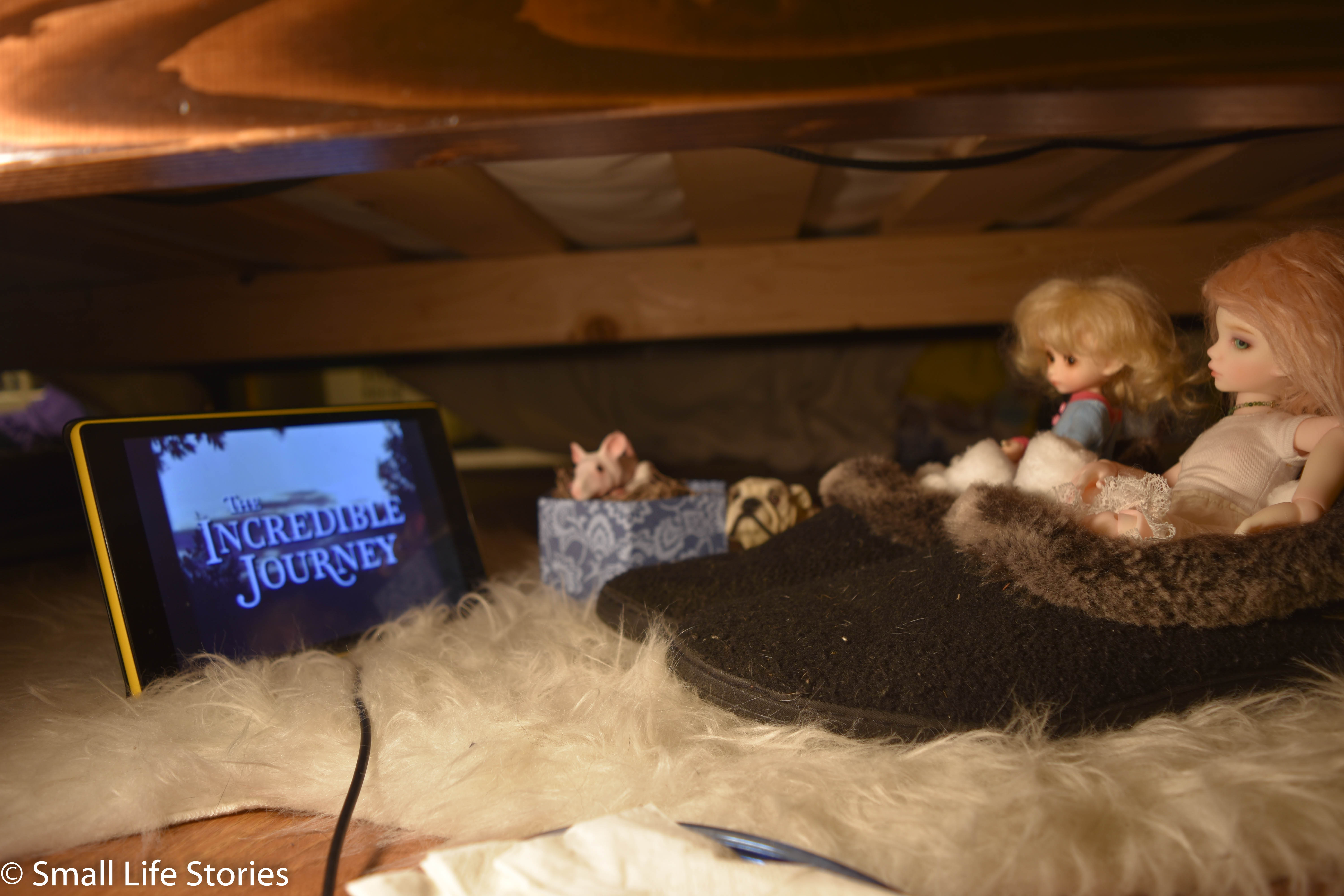 Sharing a few shots from last night, when the cast of Underfoot was all cozied up in their beds watching Incredible Journey.