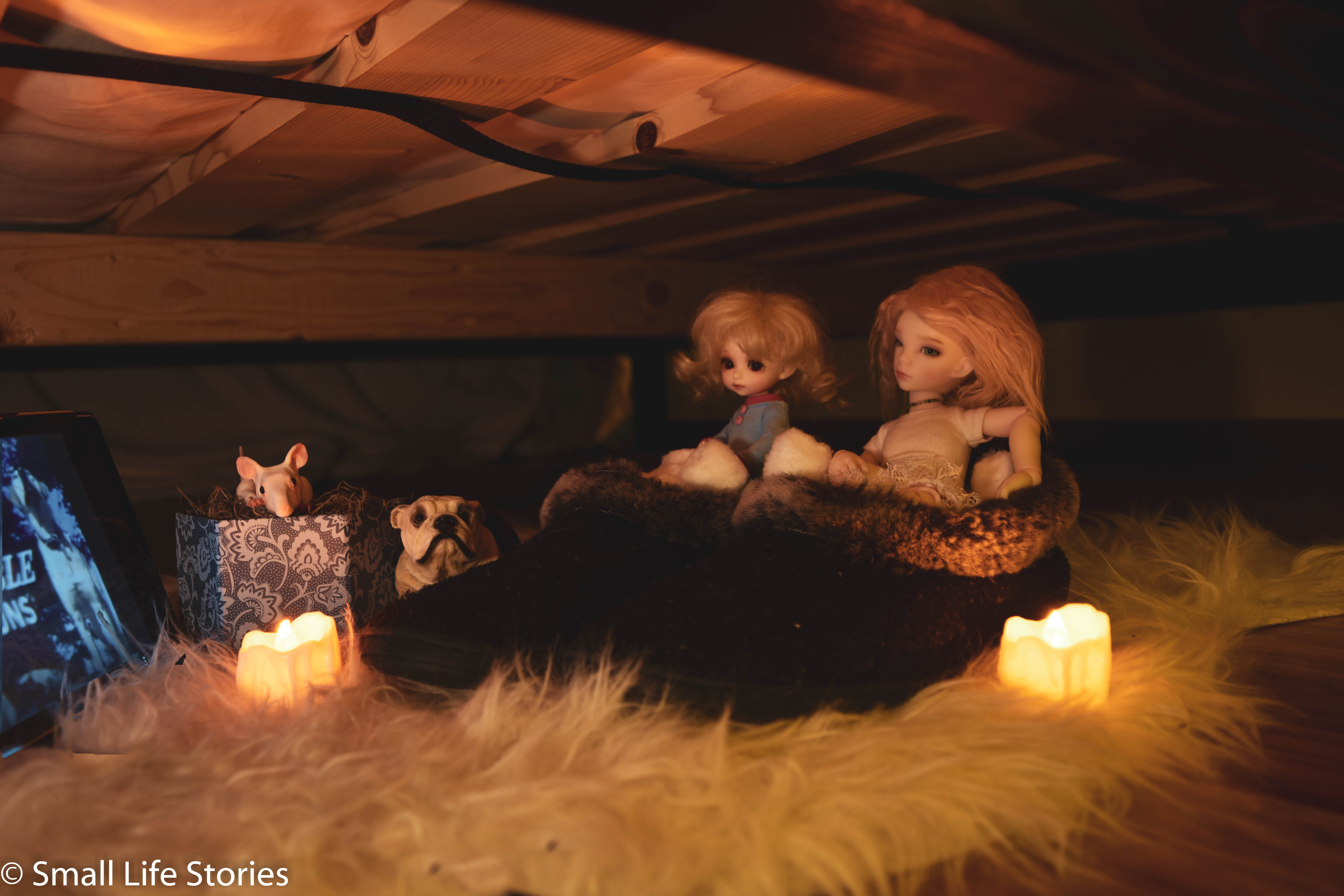 And ended up using this shot, with a mixture of two LED tealights plus one solid beam, and then adjusted to exposure to make it look like it’s just lit by the tealights.